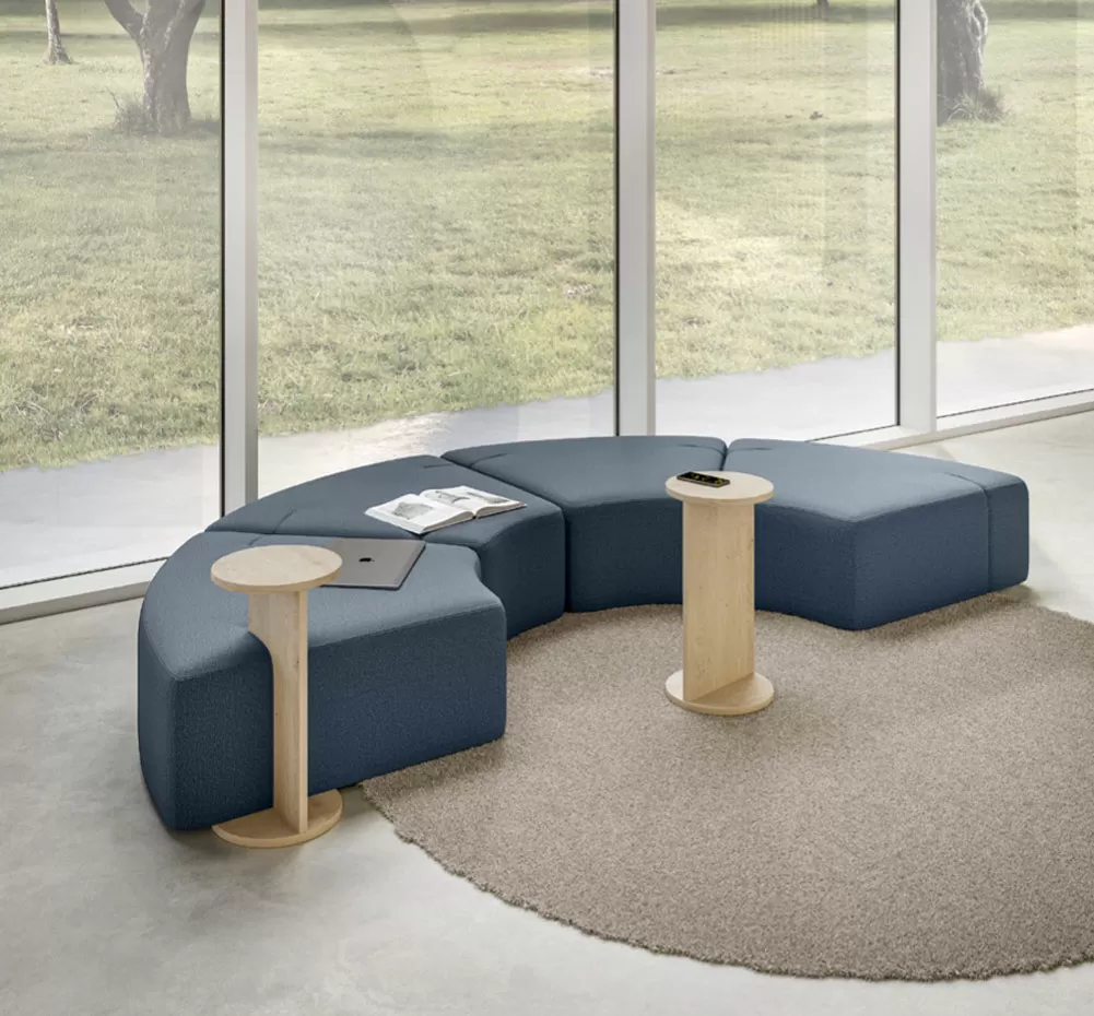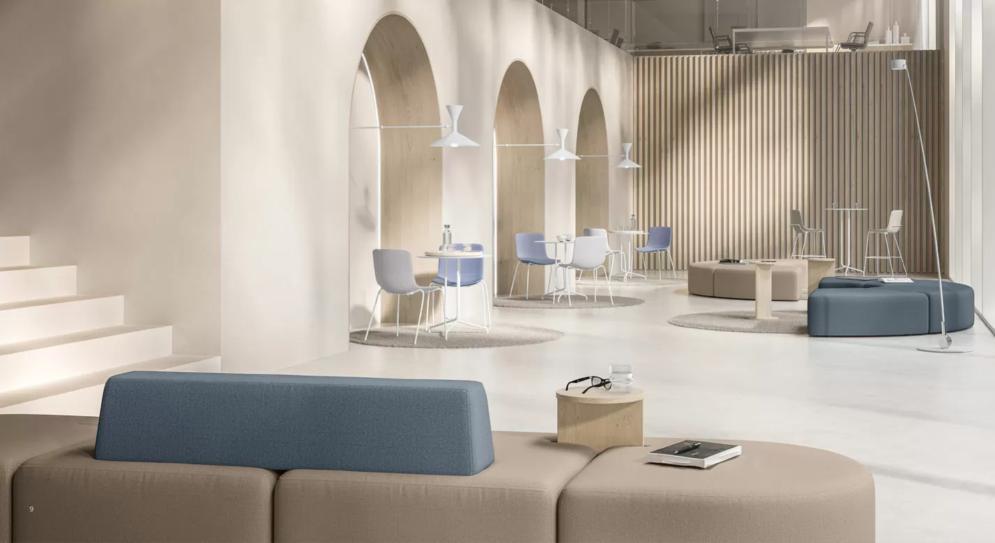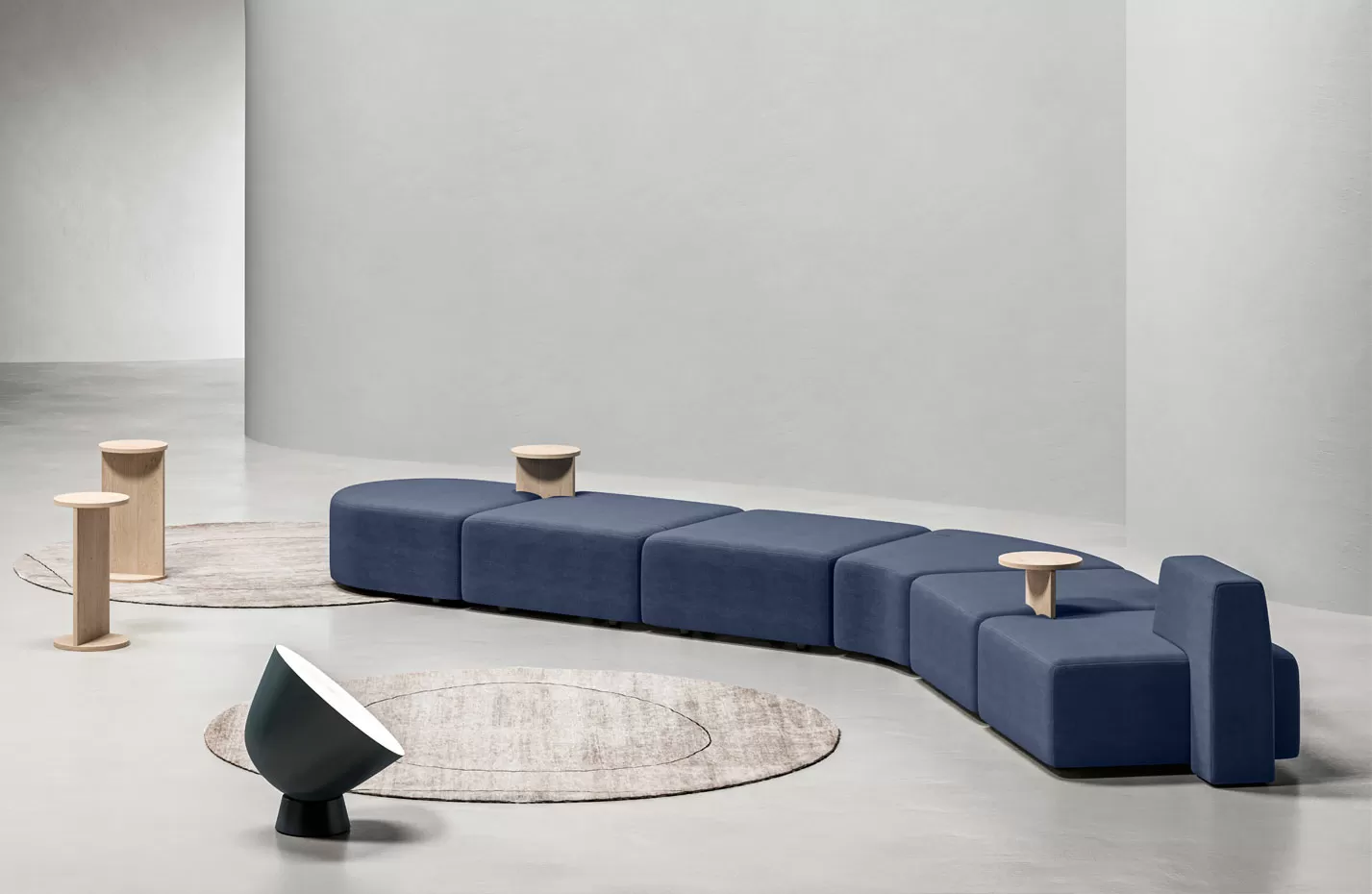 Лаконичный, минималистичный дизайн позволяет легко комбинировать отдельные модули, формируя геометрию пространства в зависимости от его назначения и бизнес-задач компании, наилучшим образом соответствуя индивидуальным требованиям заказчика. Широкий ассортимент пуфов различных форм и размеров легко можно комбинировать со спинками, подлокотниками, журнальными столиками и другими аксессуарами. Чехлы полностью снимаются, а отдельные элементы коллекции можно легко отремонтировать и разобрать.