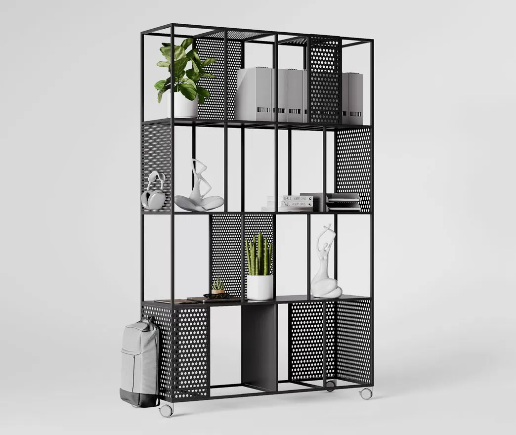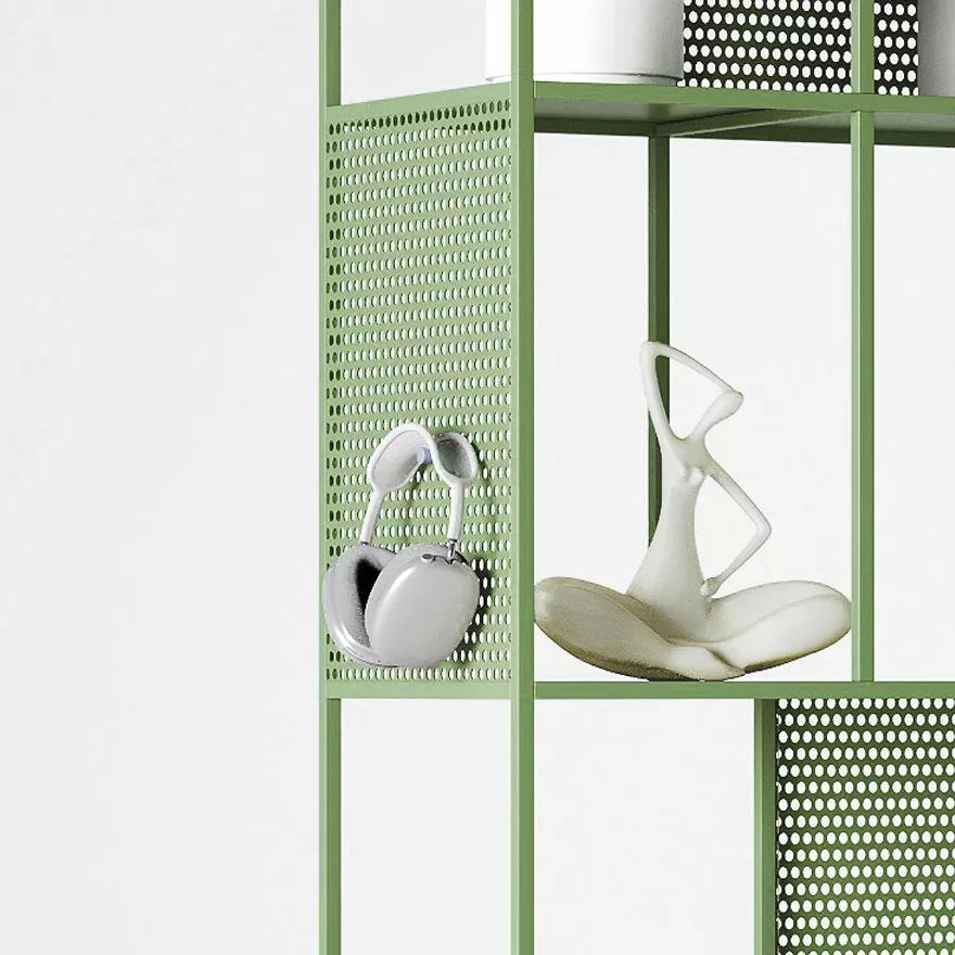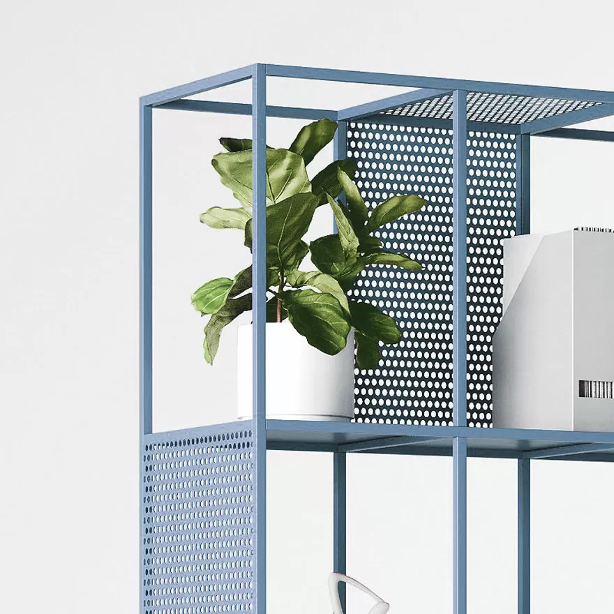 MindFrame оснащен двумя видами перфорации: крупной для винтовых крючков, на которые удобно вешать сумки и наушники. Полки легко снимаются и устанавливаются в любой секции стеллажа, а одинаковая высота секций позволяет перемещать перфорированные стенки и создавать пространства разной ширины, формируя индивидуальные зоны. MindFrame имеет доступ с обеих сторон, что делает его идеальным для размещения между рабочими местами. Сотрудники могут легко использовать его с любой стороны, гибко организуя свое рабочее пространство. Отсутствие верхней крышки позволяет размещать высокие или ампельные растения, добавляя зелени в офисный интерьер.