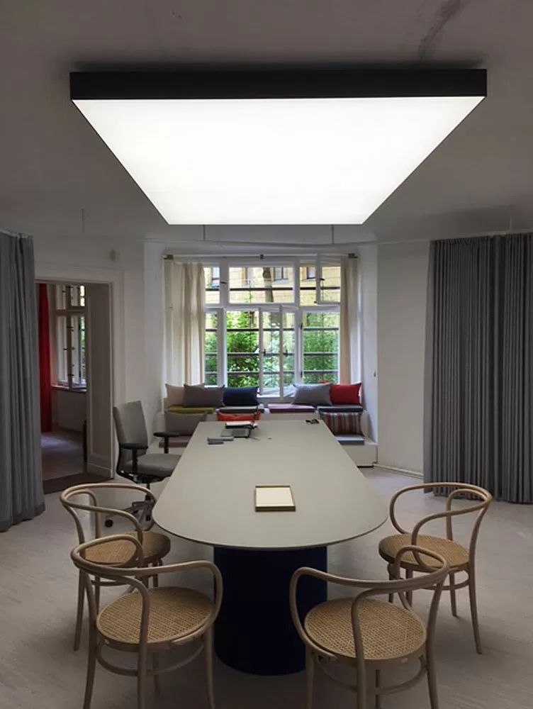 Благодаря системе отражений и специальному тканевому покрытию, источник света становится незаметным, что создает эффект рассеянного однородного освещения. Два варианта цветовых температур 3000К (теплый белый свет) и 4000К (холодный белый свет) еще больше усиливают схожесть с дневным освещением.