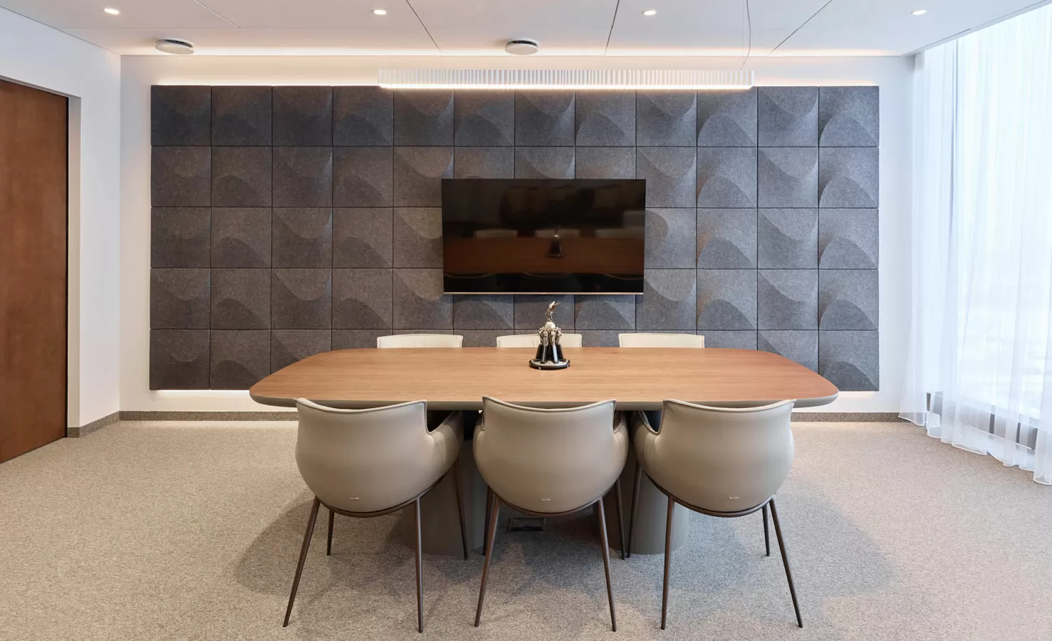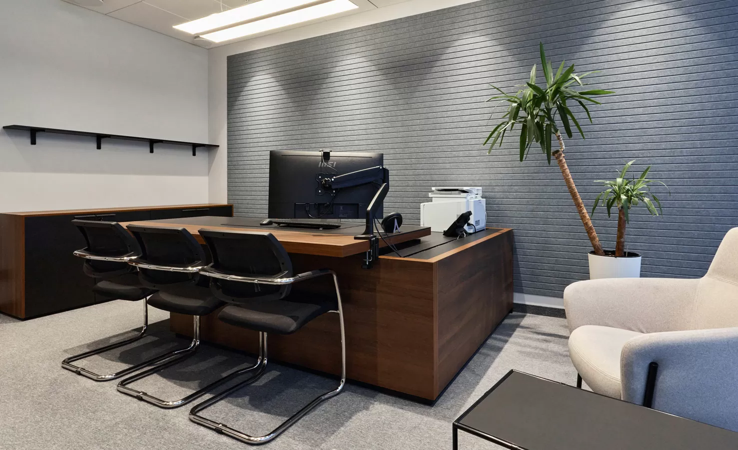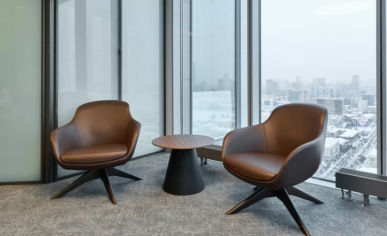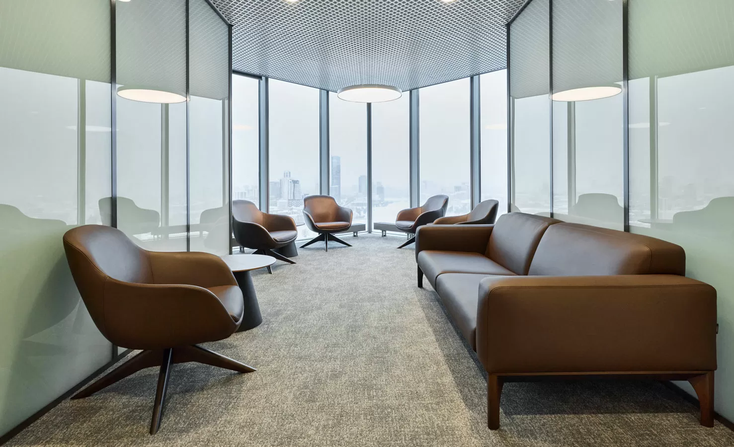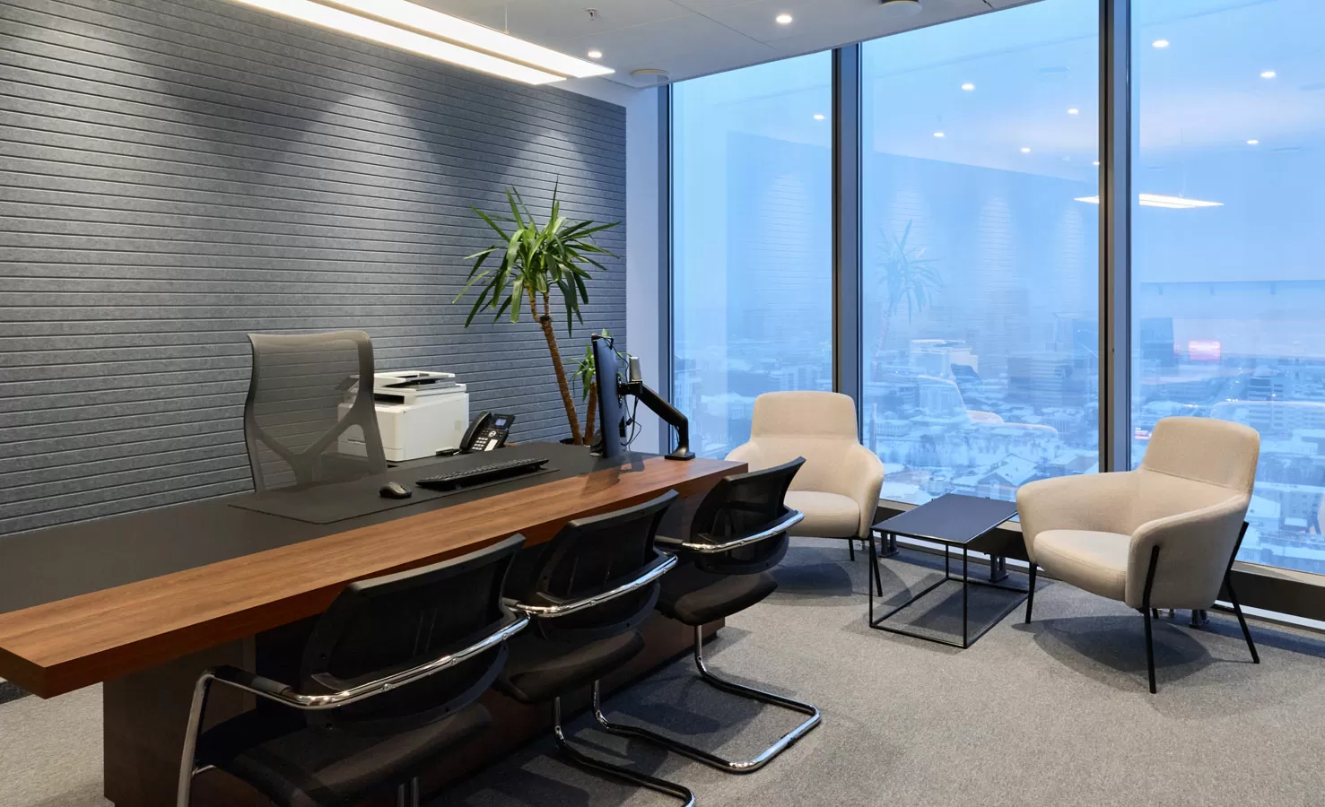 Мебель: рабочие станции Tour, столы переговоров Lava от Involux (Белоруссия) и Astro от Solo (Италия-Россия), кабинеты Rola от Involux (Белоруссия) и Murano от Solo (Россия), кофейные столы Noale от Solo (Россия), Coffee Neo от RF Group (Италия), Festa от Solo (Италия-Россия), кофейные столы и стол переговоров от ТОК Мебель (Россия), зоны хранения, шкафы, приемная стойка индивидуального изготовления