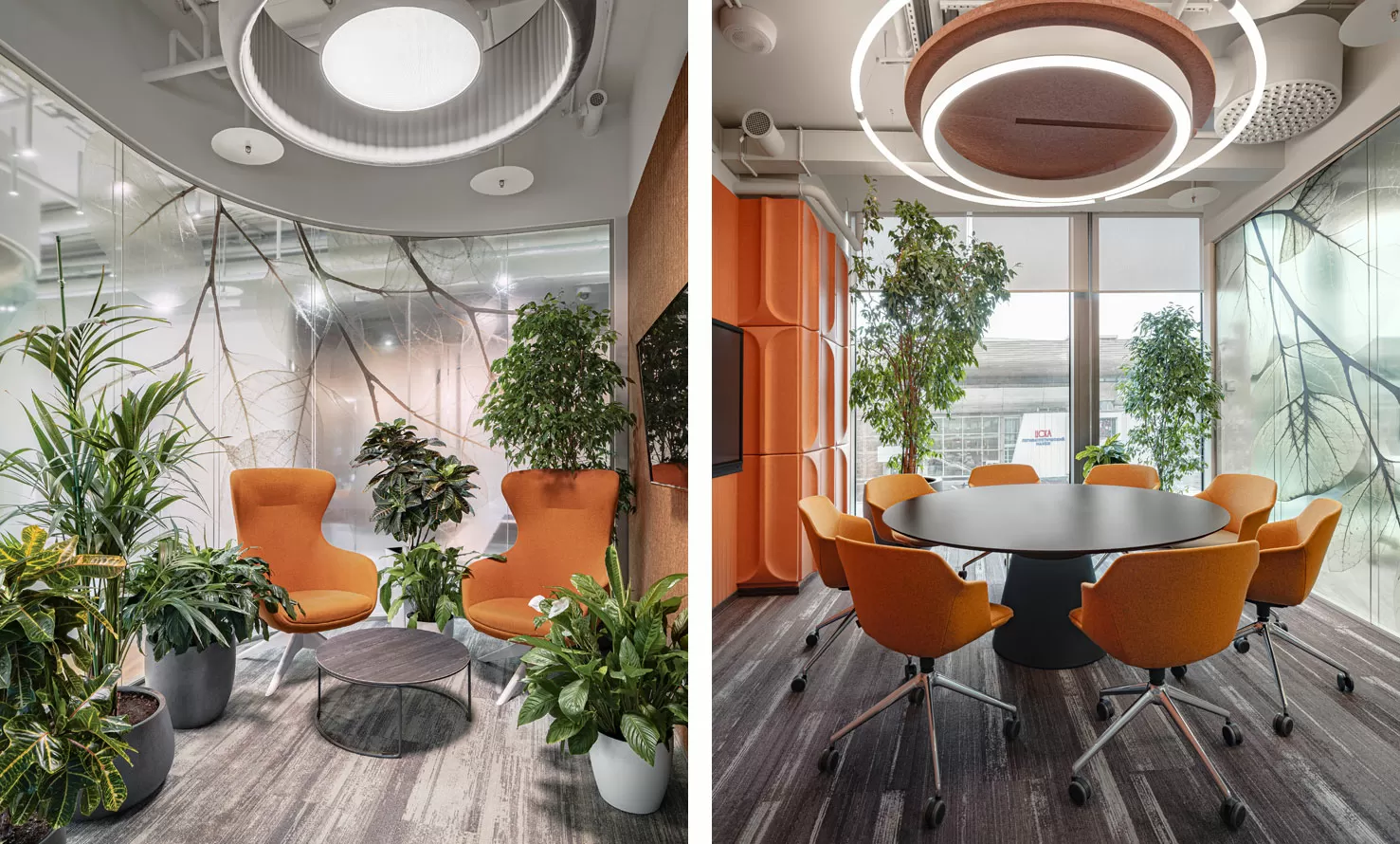 Кроме того, массивные пилоны вдоль фасада облицованы индивидуально разработанными фетровыми панелями, которые не только выполняют декоративную функцию, но и значительно улучшают акустический комфорт в рабочей зоне. Дизайн офиса полностью поддерживает задачи компании по созданию комфортного и вдохновляющего пространства для сотрудников.
