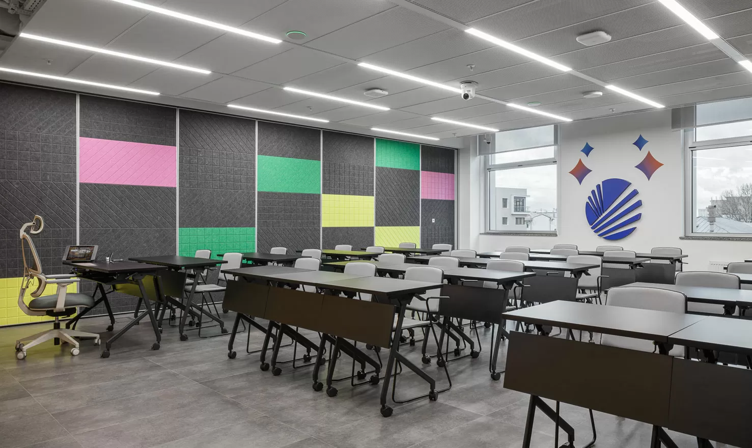 Пространство рассчитано на 60 рабочих мест и 465 учебных мест, включая 44 аудитории, 12 трансформируемых лекционных залов, коворкинги, профессорские клубы, переговорные, чат-румы, библиотеку, кинозал и спортивные зоны. Мы поставили мебель для различных функциональных зон: от учебных аудиторий и конференц-залов до зон отдыха и кабинетов менеджмента, в том числе кастомизированные решения, мобильную и мягкую мебель.