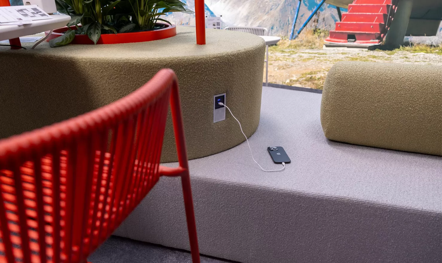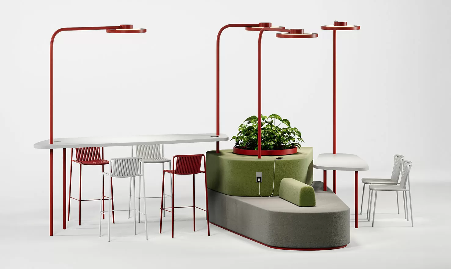 Transit Hub гармонично вписывается в экосреду, сочетая функциональность рабочего пространства с комфортом и социальной атмосферой кафе и зон отдыха. Хаб спроектирован так, чтобы избежать деления зон на основные и второстепенные. Удобные места для сидения, разноуровневые столы, островки зелени, беспроводная зарядка гаджетов, легкий доступ к кофе-поинту объединены в единую концепцию, подходящую для разнообразных видов деятельности — от неформальных мозговых штурмов до сосредоточенной индивидуальной работы.