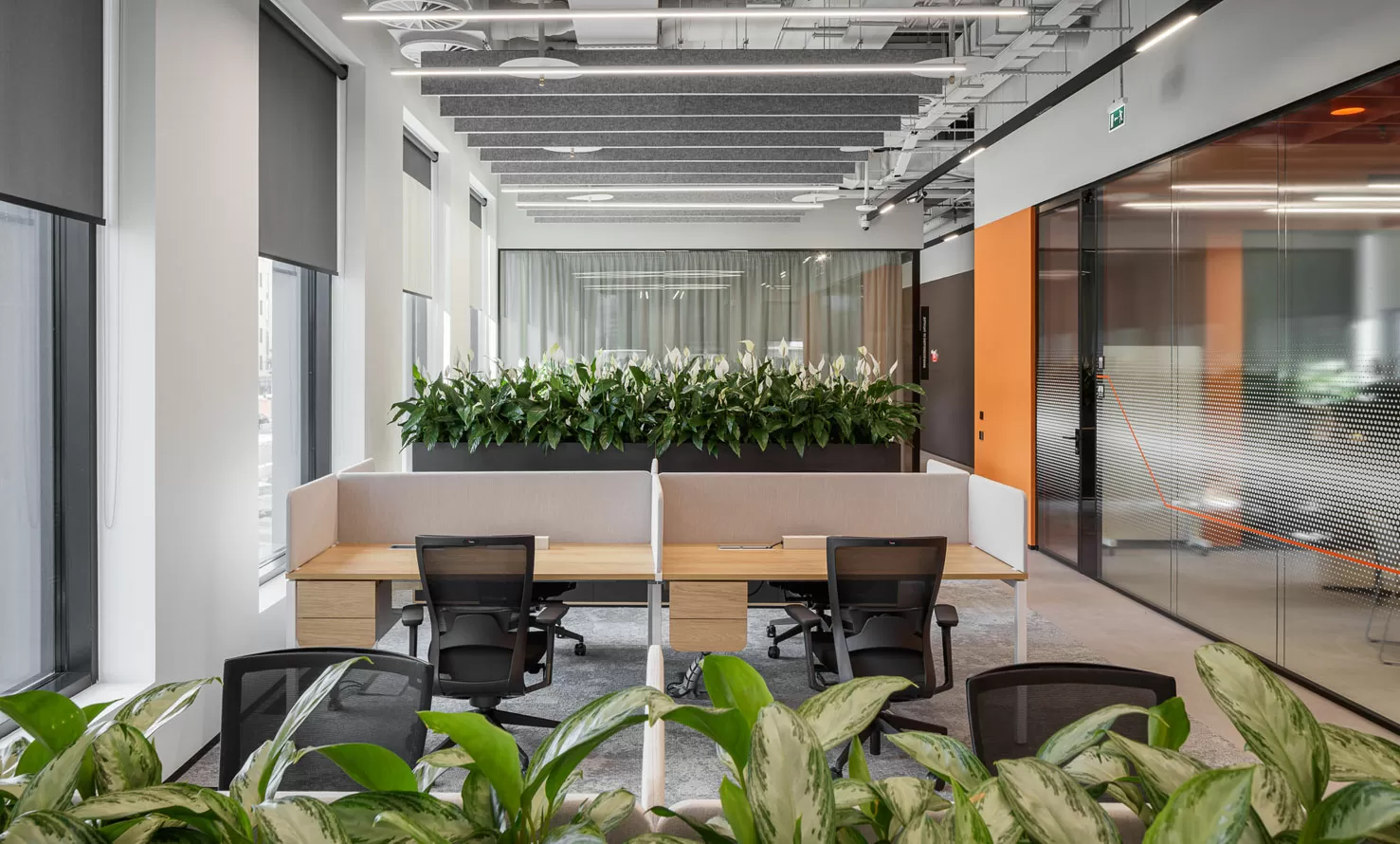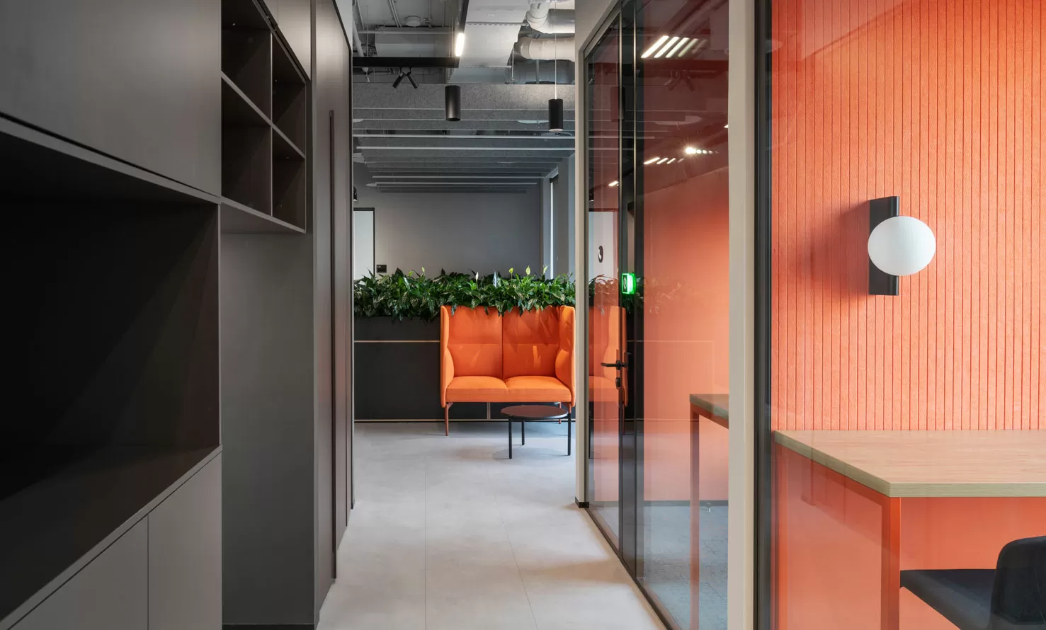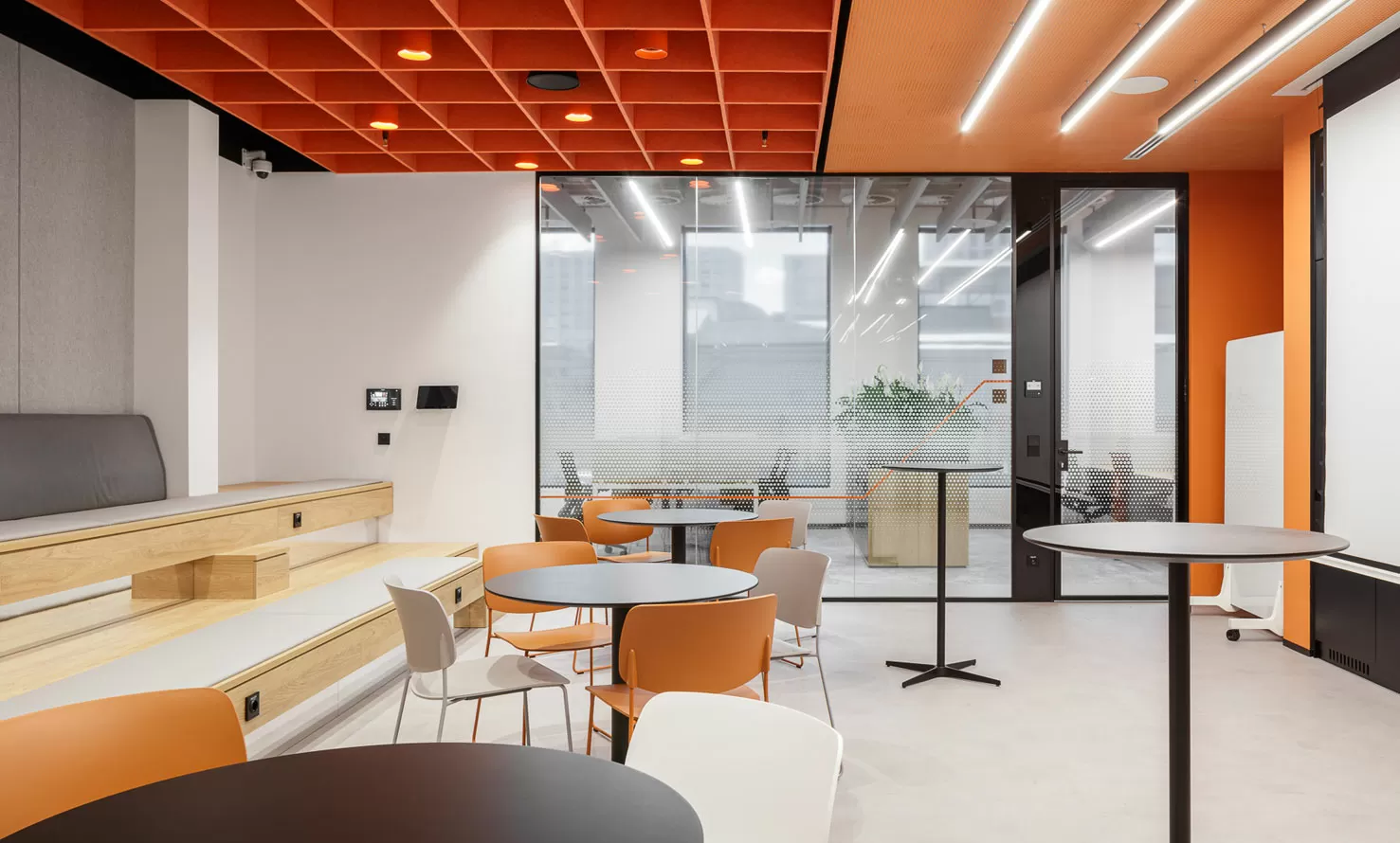 Solo предоставила мебель и кресла, обеспечивая удобство работы и легкость взаимодействия между коллегами. В общественных зонах, оформленных мягкой мебелью и кофейными столиками от Solo, преобладают яркие оранжевые и контрастные черные цвета, создающие динамичную атмосферу. В рабочих зонах использованы светлые и спокойные оттенки, которые гармонично сочетаются с зелеными зонами-баффлами, создавая комфортное пространство для обучения и развития.